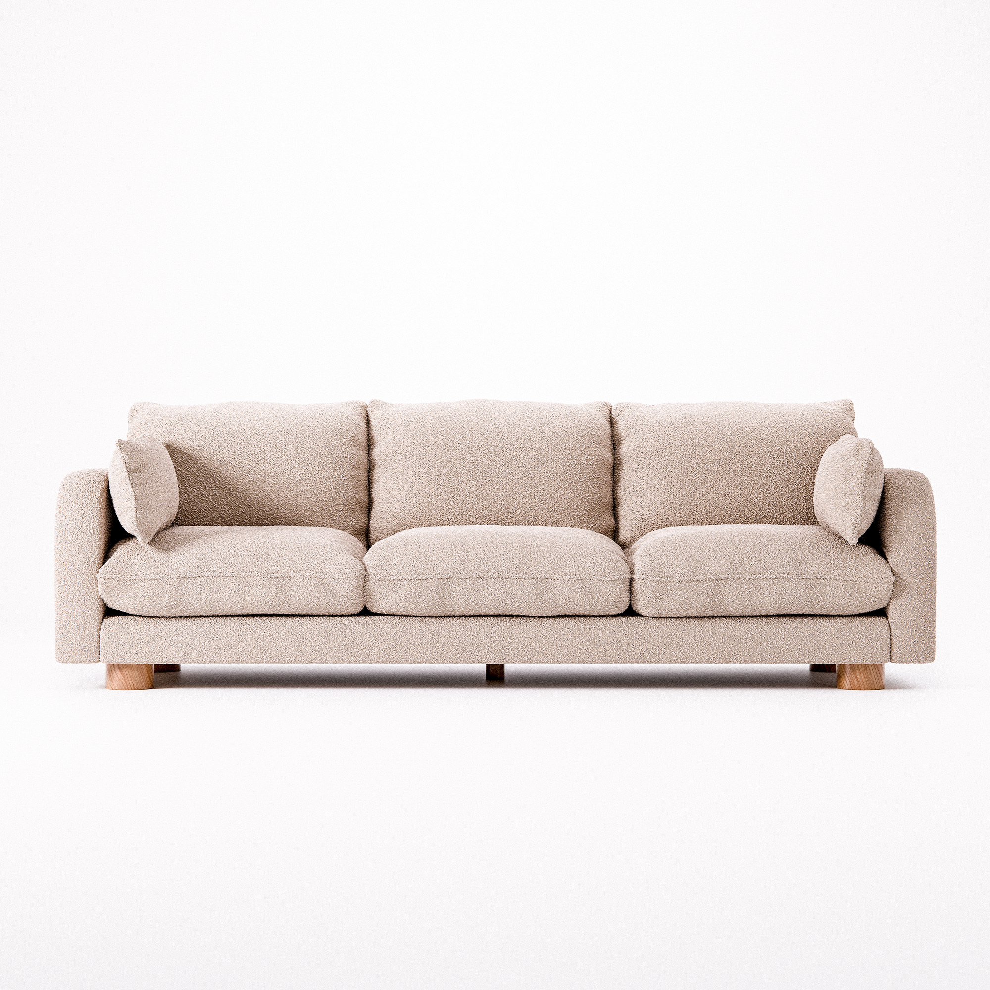 Miles Sofa Boucle Beige is a three seater sofa with a frame made of solid spruce, plywood, and a filling of duck down, silicone marbles, and foam. The sofa is upholstered in a boucle fabric from Limonta. In addition to this three seater sofa, the Miles series also includes an armchair and a love seat.