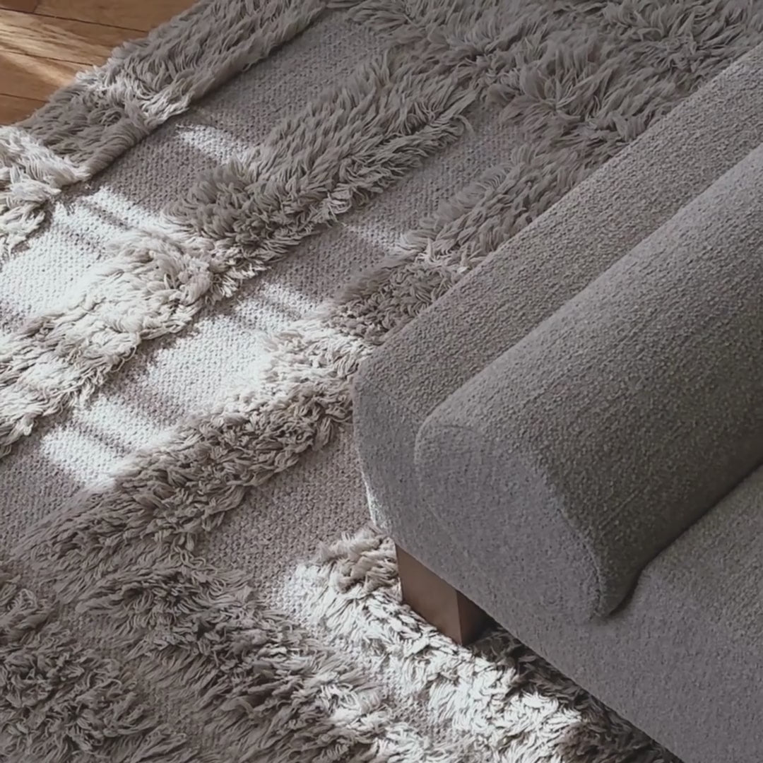Shaggy Labyrinth Grey Rug is a patterned rug made from 100 % wool. By combining two types of production techniques, flat weave and shaggy pile, the rug gets its unique high and low look. Shaggy Labyrinth is available in three sizes and in a beige and white version in addition to this grey model.