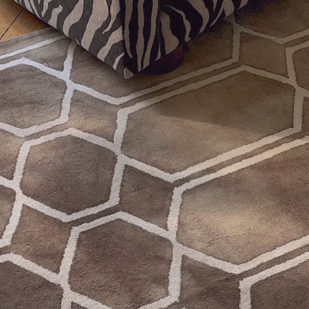 Tie Dye Beige Rug is a hand tufted rug made from 100 % wool. The rug has a timeless pattern with influences from art deco as well as Moroccan Berber rugs. Through a dip dye technique, each rug is dyed individually which makes the colours vary in hue and intensity. This also means that each rug is unique. The Tie Dye Beige Rug comes in three sizes: 200 x 300 cm, 250 x 350 cm, and 300 x 400 cm. In addition to this version, the Tie Dye Rug is also available in Graphite Ink and Sage Green.